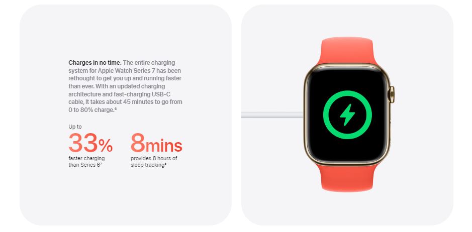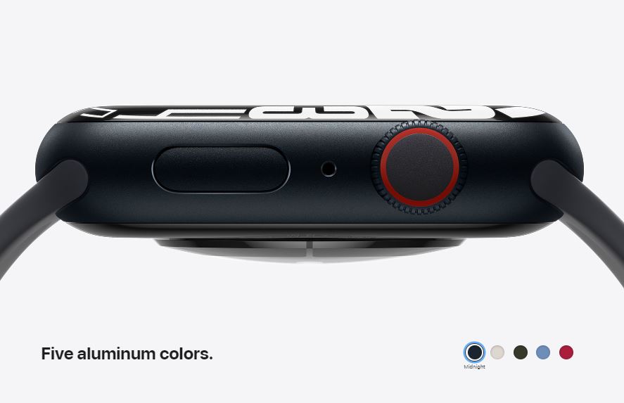 | Features / Specifications | Retina LTPO OLED display, 1,000 nits GPS and GPS + Cellular models S7 SiP with 64-bit dual-core processor Blood oxygen sensor,Electrical heart sensor and third-generation optical heart sensor,High and low heart rate notifications,Irregular heart rhythm notification water resistant 50 meters,Wi-Fi,Bluetooth 5.0,GPS/GNSS,Compass 32GB capacity Faster charge time |