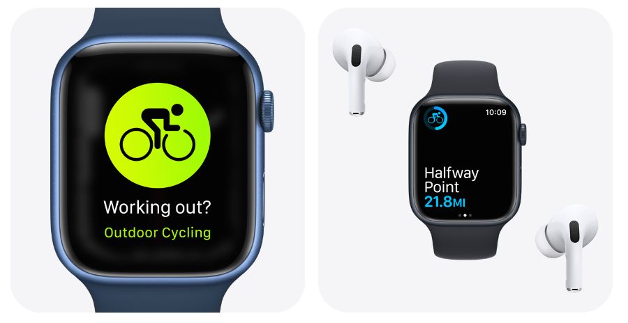 Apple Watch automatically detects when you begin pedaling and reminds you to start a workout. Fall detection, optimized for cycling and other workouts,can call emergency services if you take a spill.11 And to help you keep your eyes on the road, a voice feedback feature announces workout milestones, like speed, distance, and more. For e‑bikes, an improved algorithm more accurately calculates calories.