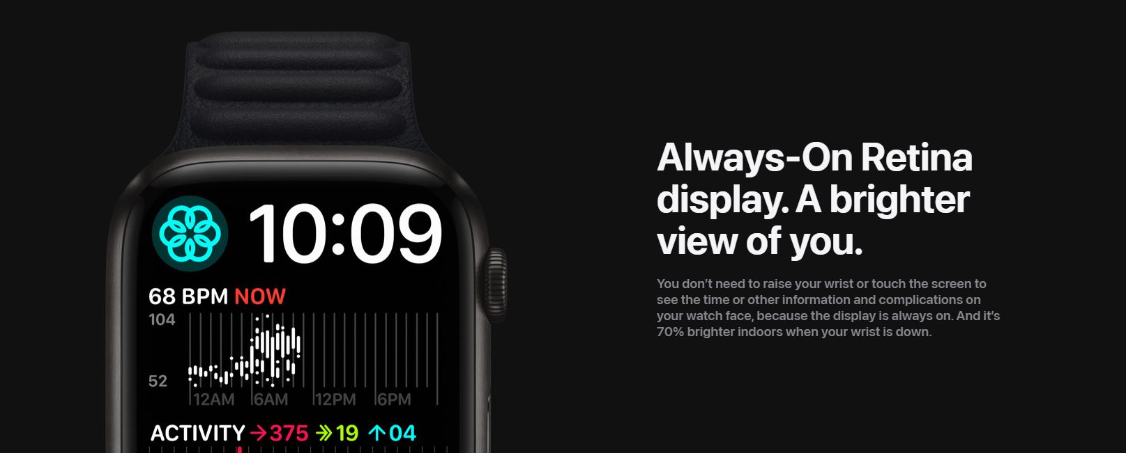 The larger display enhances the entire experience, making Apple Watch easier to use and read. Series 7 represents our biggest and brightest thinking.