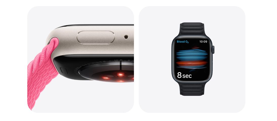 Your blood oxygen level is a key indicator of your overall wellness. It can help you understand how well your body is absorbing oxygen and the amount of oxygen delivered to your body. The remarkable sensor and app in Apple Watch Series 7 allow you to take on‑demand readings of your blood oxygen as well as background readings, day and night.